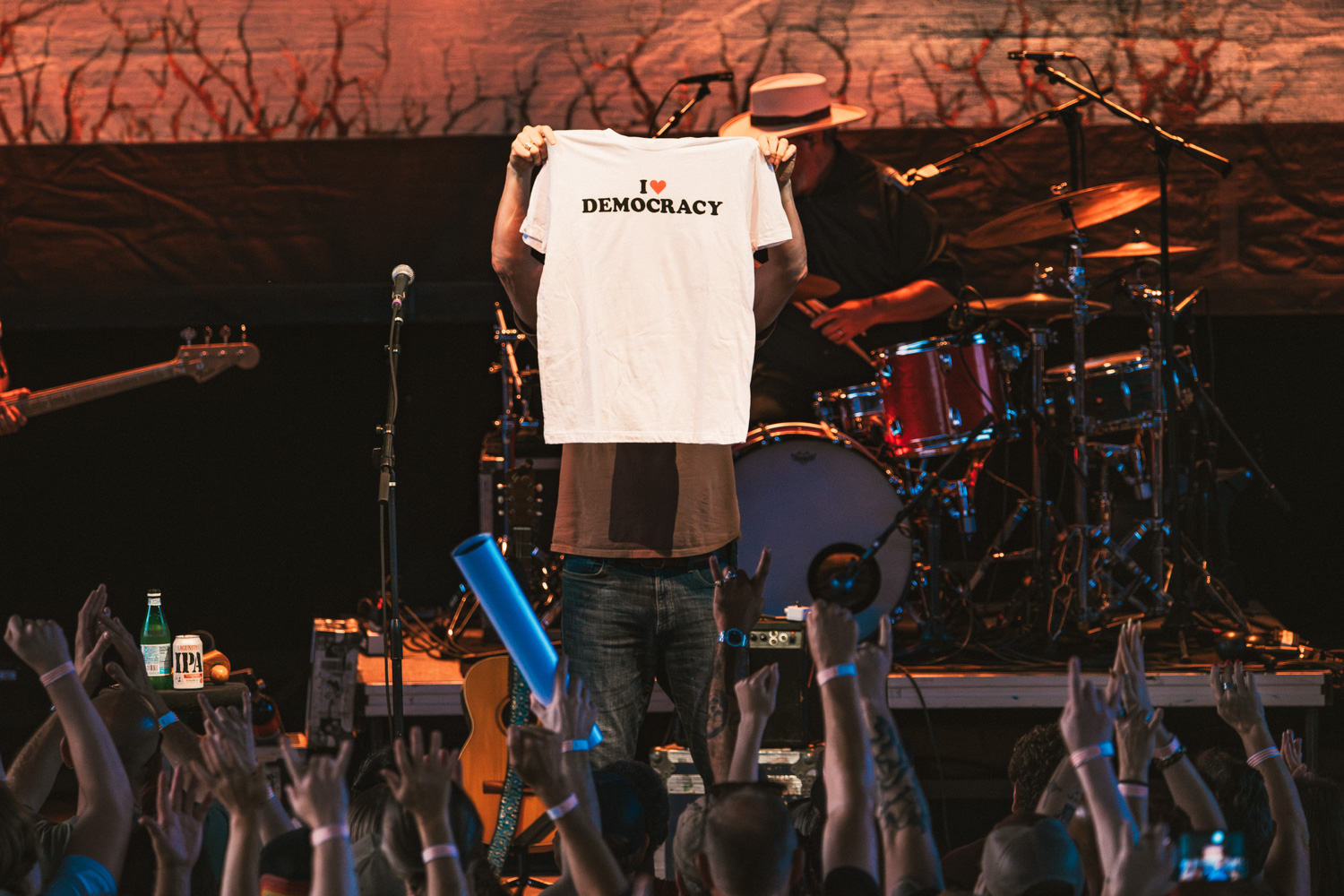 Before getting on with the music, the band’s frontman, John McCrea, holds up a t-shirt that reads “I [Heart] Democracy,” before tossing it into the crowd to eager hands. The band, while we don’t want to assume, strikes us in the jam-band-style performance style, a la Ween or Dave Matthews Band, but with comedic yet intelligent song intentions.