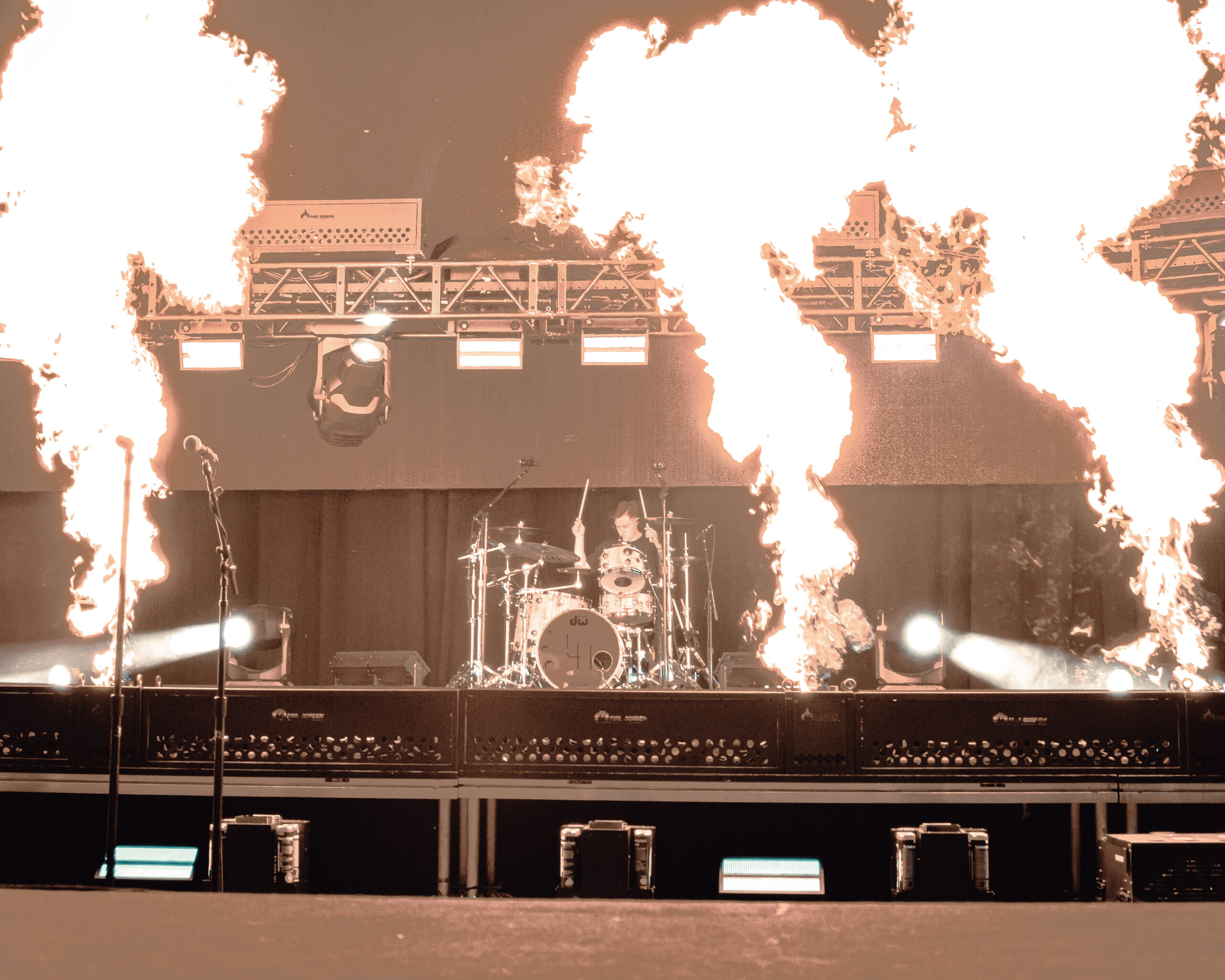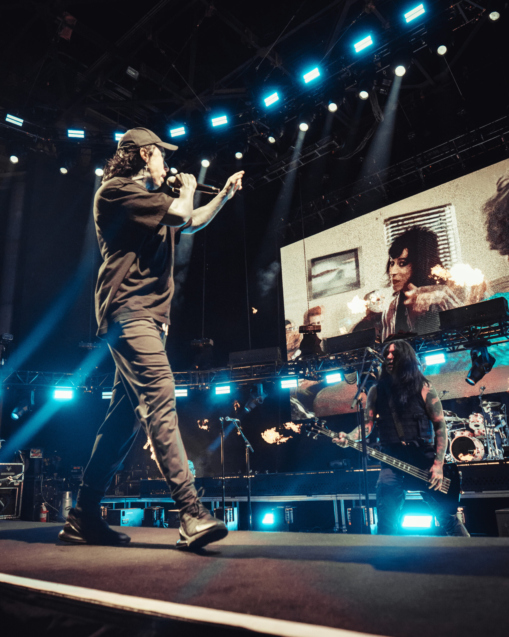 Taking the stage in the dark, the show began with a soft spotlight on vocalist Ronnie Radke during a Prequel before hammering into the opening notes of the popular 2022 single “Zombified.” Then it was time to let the flames begin, and it was far from the last time they would come out to play. In classic FIR fashion, Ronnie was upstage on a platform that he would traverse between stage left and right, while the guitarists were just behind and below him, and drummer Luke Holland recessed all the way in the back aligned perfectly with the picturesque towers of rising fire.