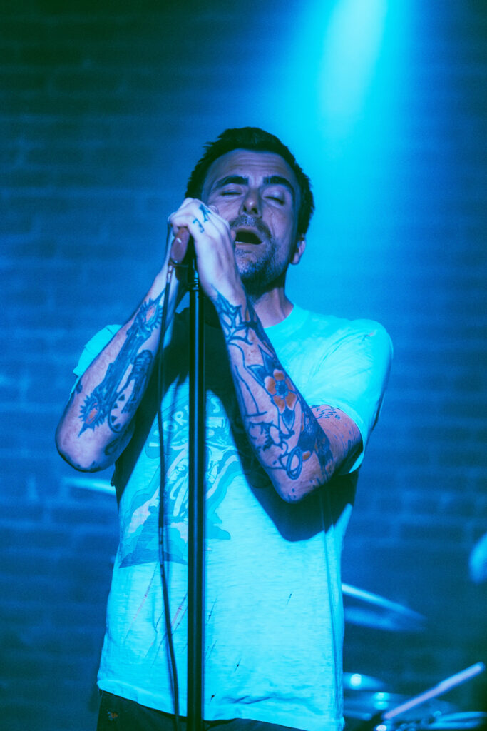 No sooner than “Like Magick” ended, the center of the room broke out into a full mosh pit, and stage diving and crowd surfers braved the hard concrete in order to feel a boost of serotonin. The lighting was supremely moody, just bright enough to catch the features of the band as they moved their way through songs like “Fatal Deluxe” and “Benadryl Subreddit,” which both had accompanying merch on the back wall.