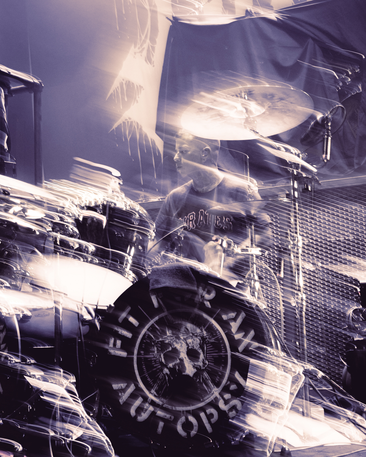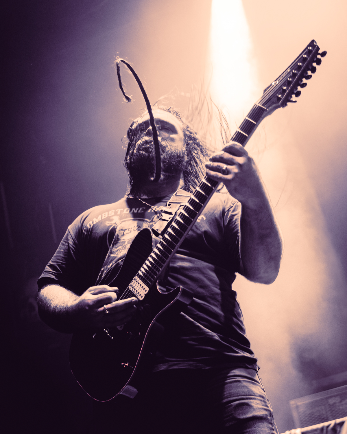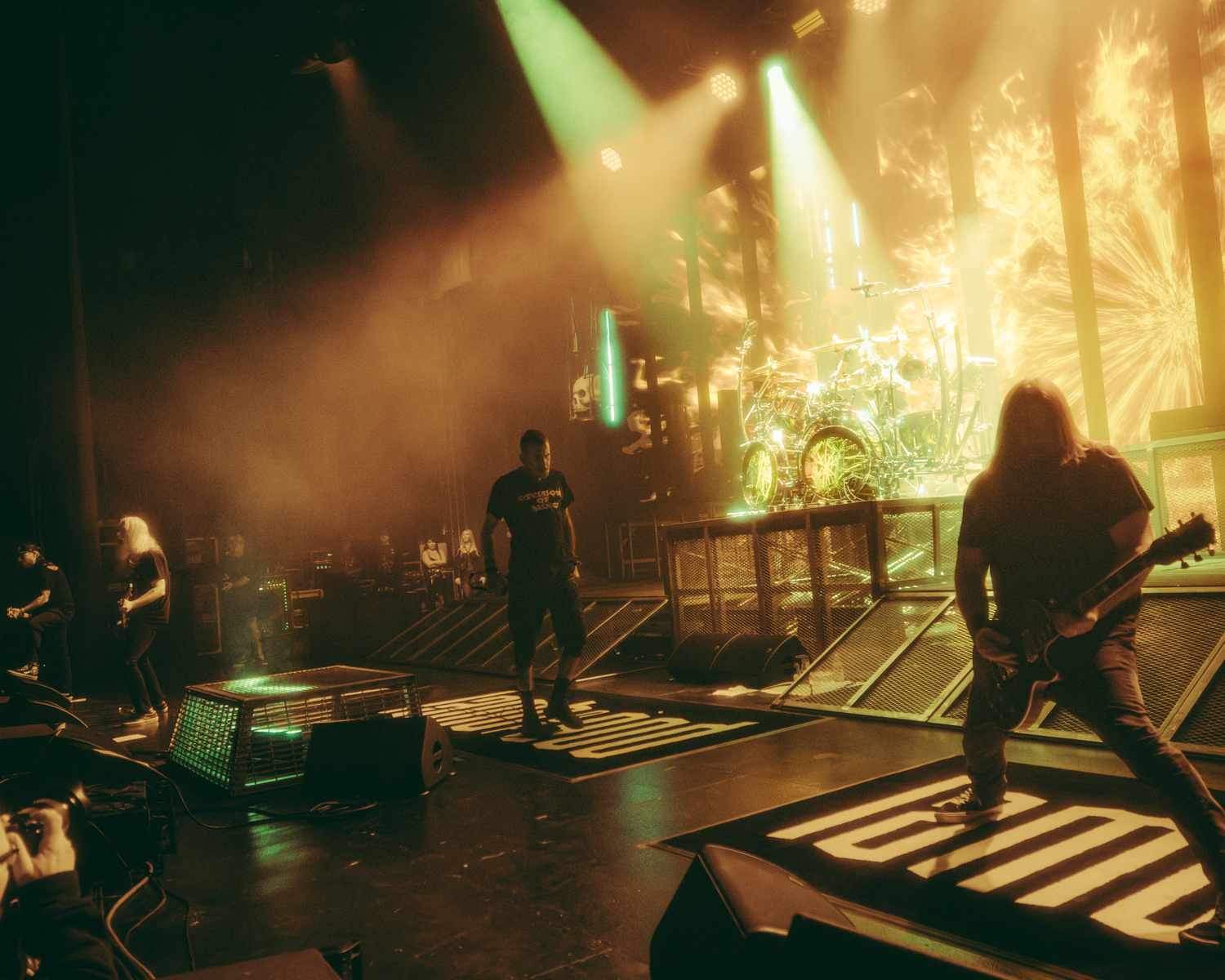 At last, the moment everyone had been waiting for. As the lights dimmed, with a curtain draped across the stage, the whole room waited in anticipation. As the fading light of the Lamb of God logo, it served as both a warm welcome and perhaps a final warning before what would momentarily take place. After a breathless beat, it cascaded to the floor, revealing the band as the opening notes of the band’s 2003 album opener “Ruin” rang out, immediately sending a surge of energy through the theater.
