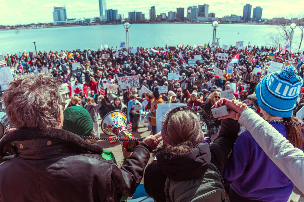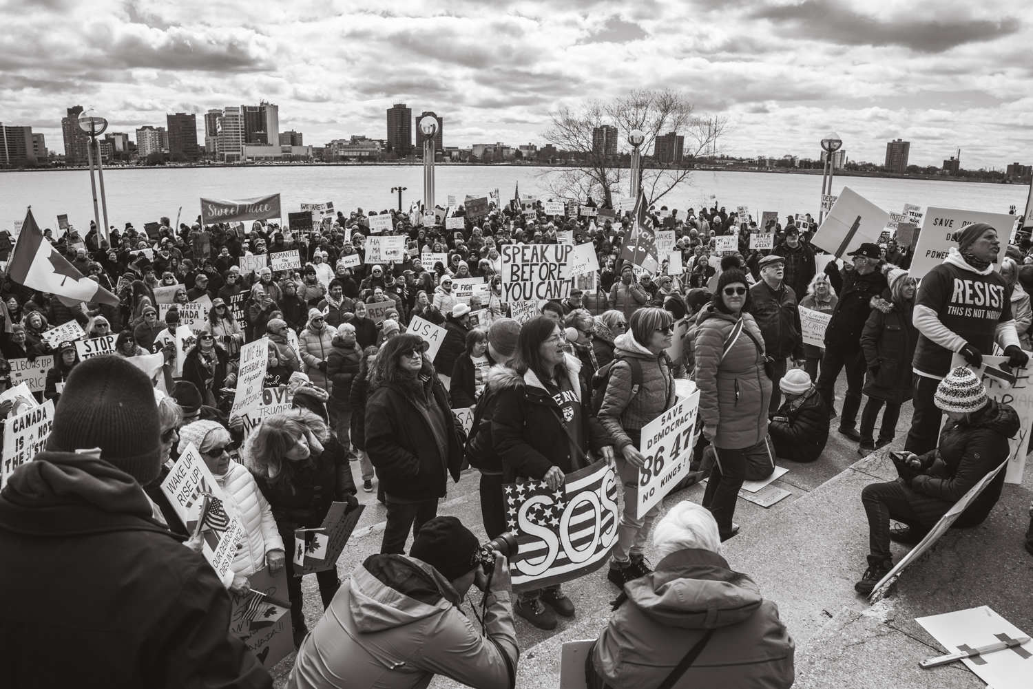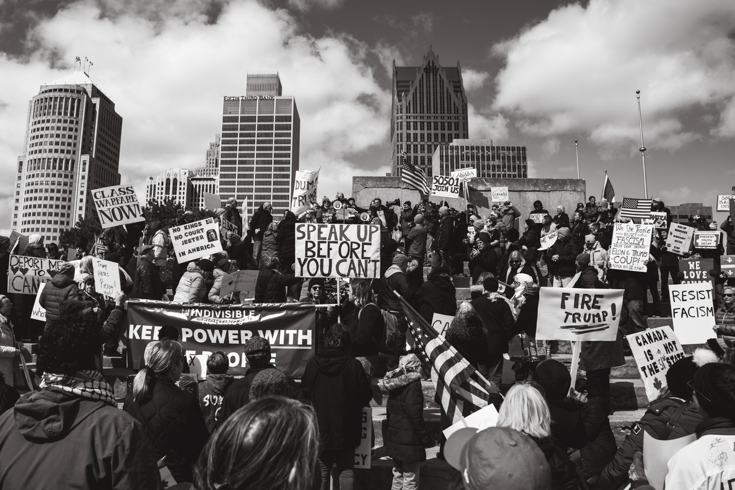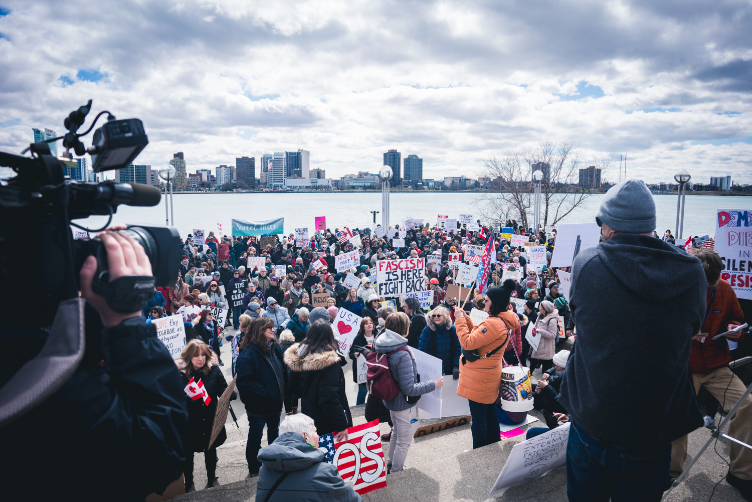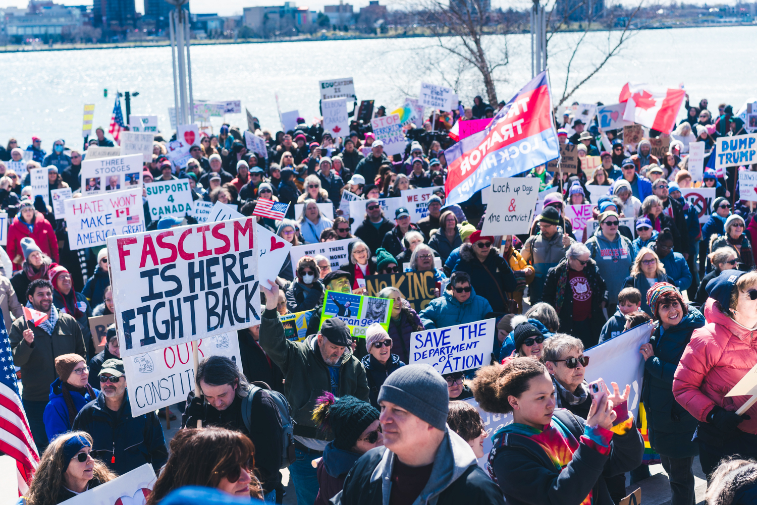 On March 22, 2025, a crowd anywhere from 600 to over 1,000 people flocked to Hart Plaza and across the Detroit River in Canada to protest Donald Trump, Elon Musk, Fascism, Oligarchy, and more.