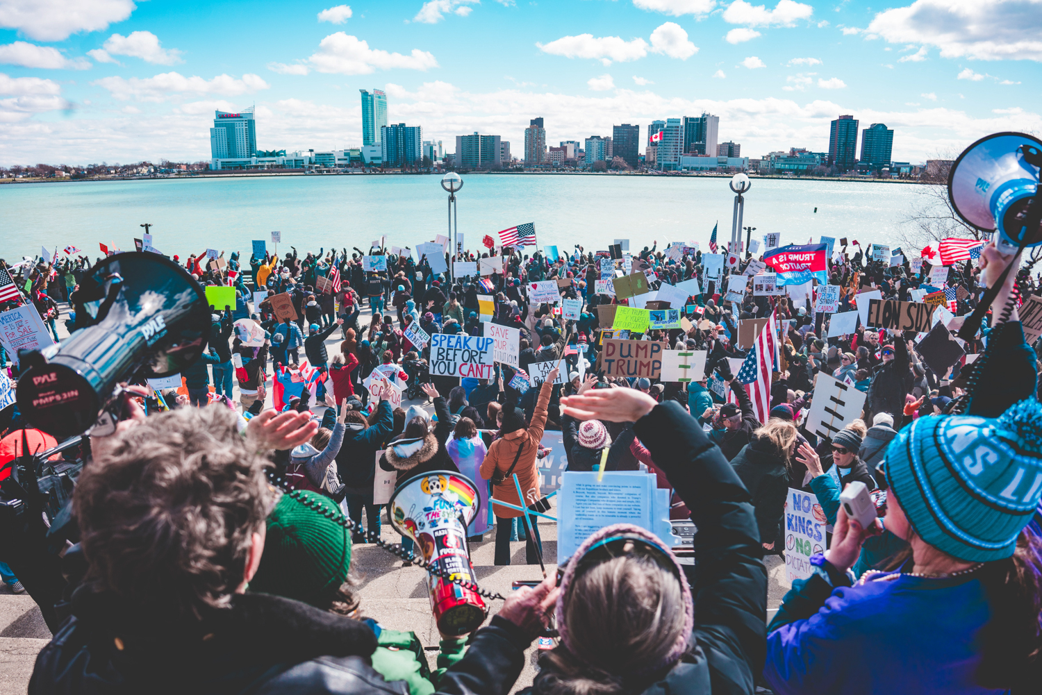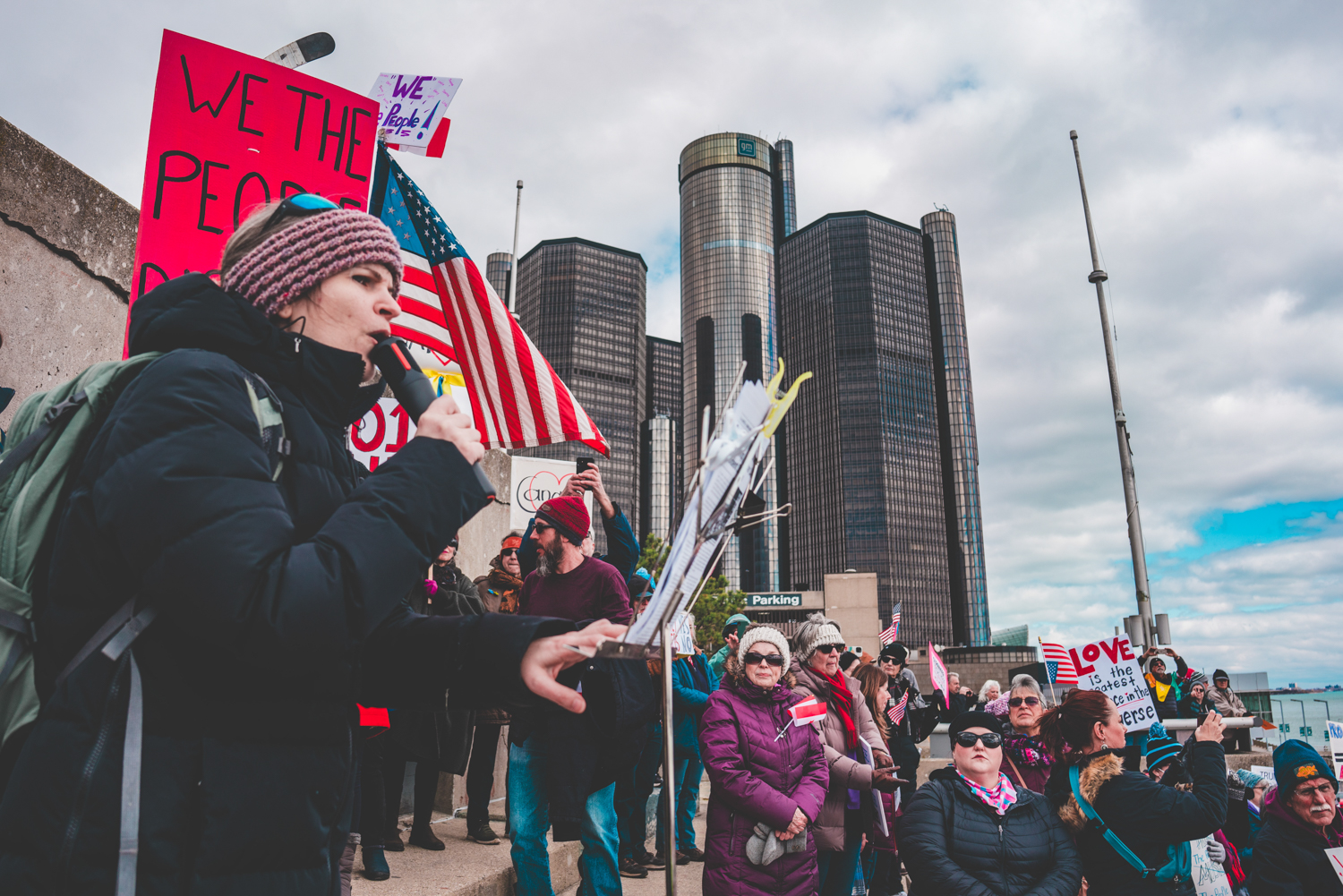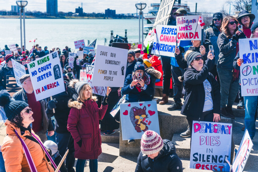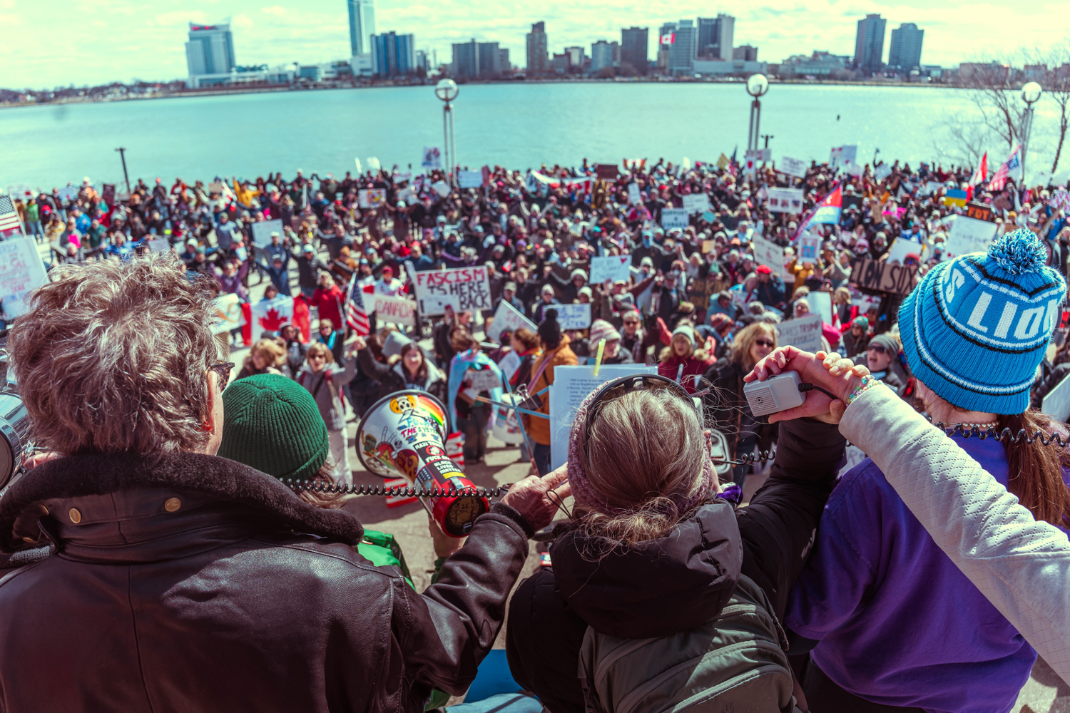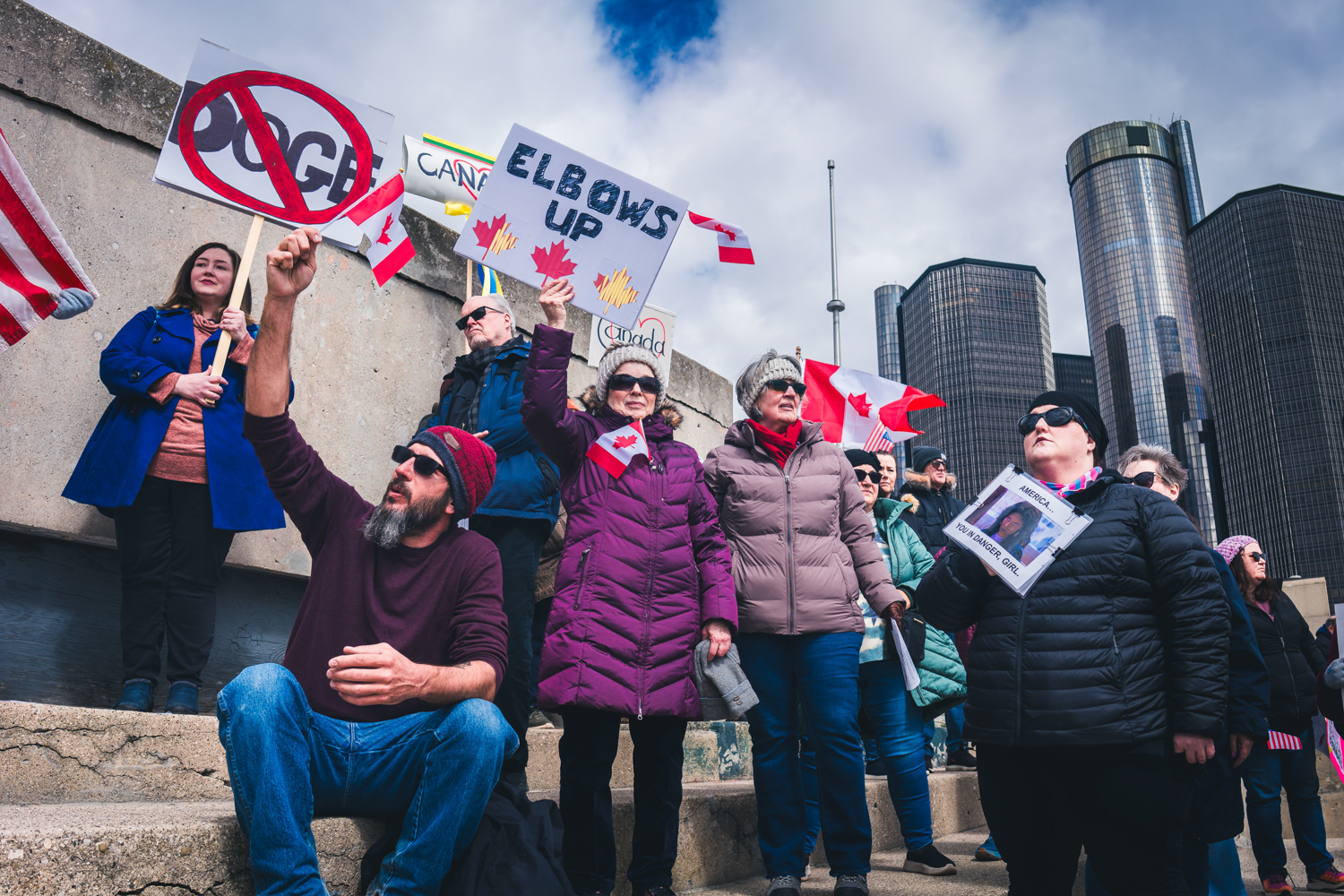 On March 22, 2025, a crowd anywhere from 600 to over 1,000 people flocked to Hart Plaza and across the Detroit River in Canada to protest Donald Trump, Elon Musk, Fascism, Oligarchy, and more.