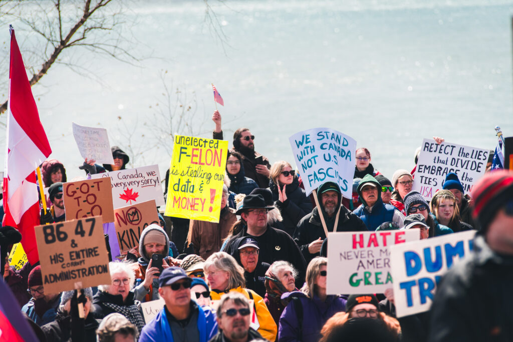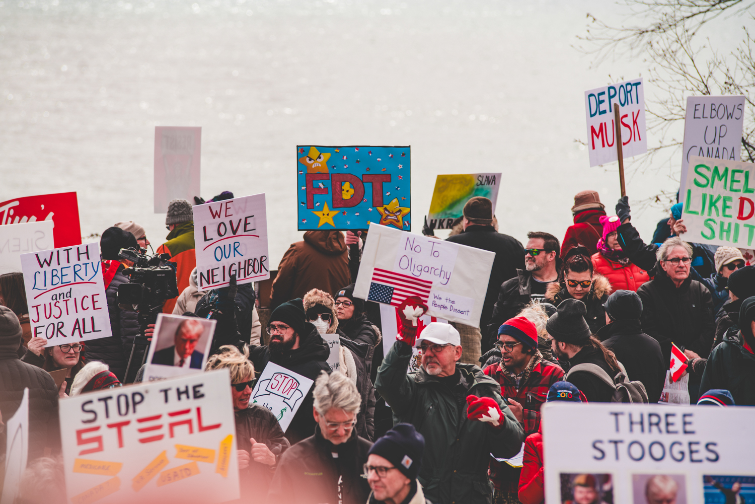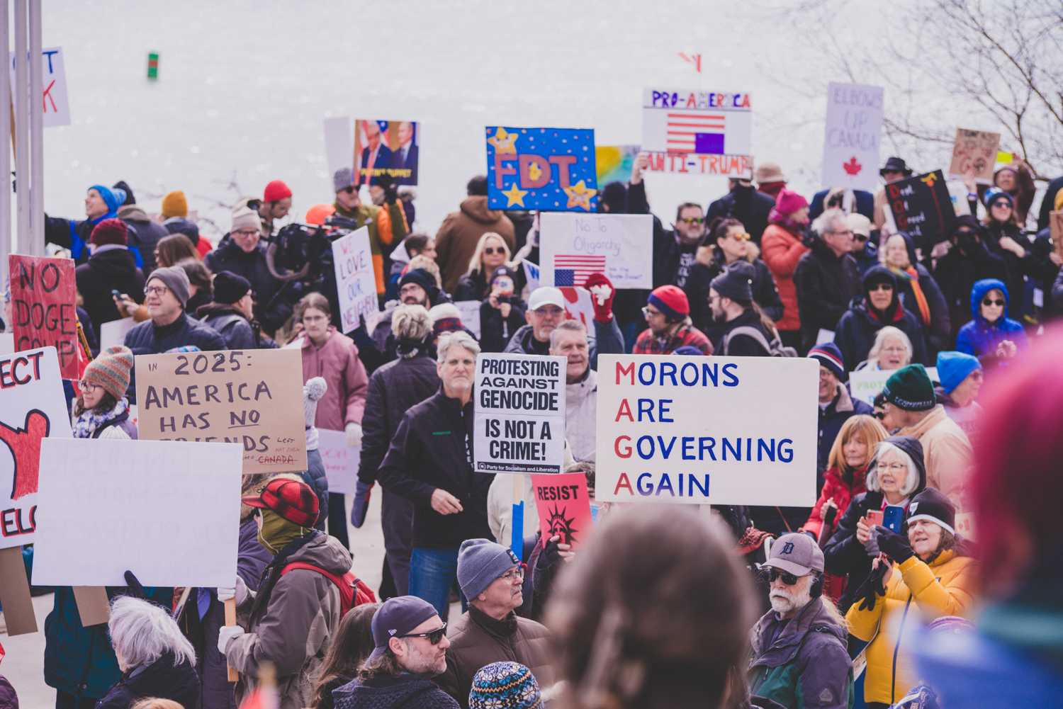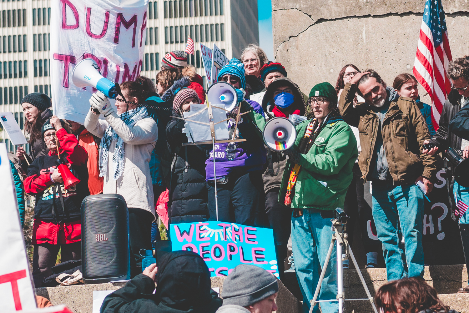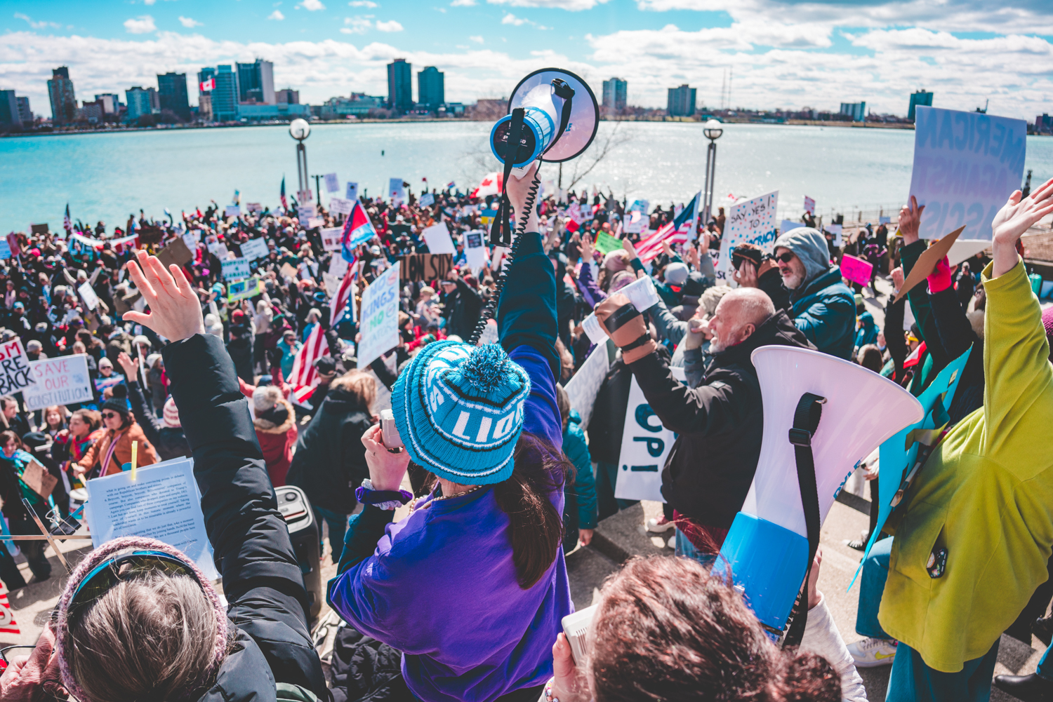On March 22, 2025, a crowd anywhere from 600 to over 1,000 people flocked to Hart Plaza and across the Detroit River in Canada to protest Donald Trump, Elon Musk, Fascism, Oligarchy, and more.
