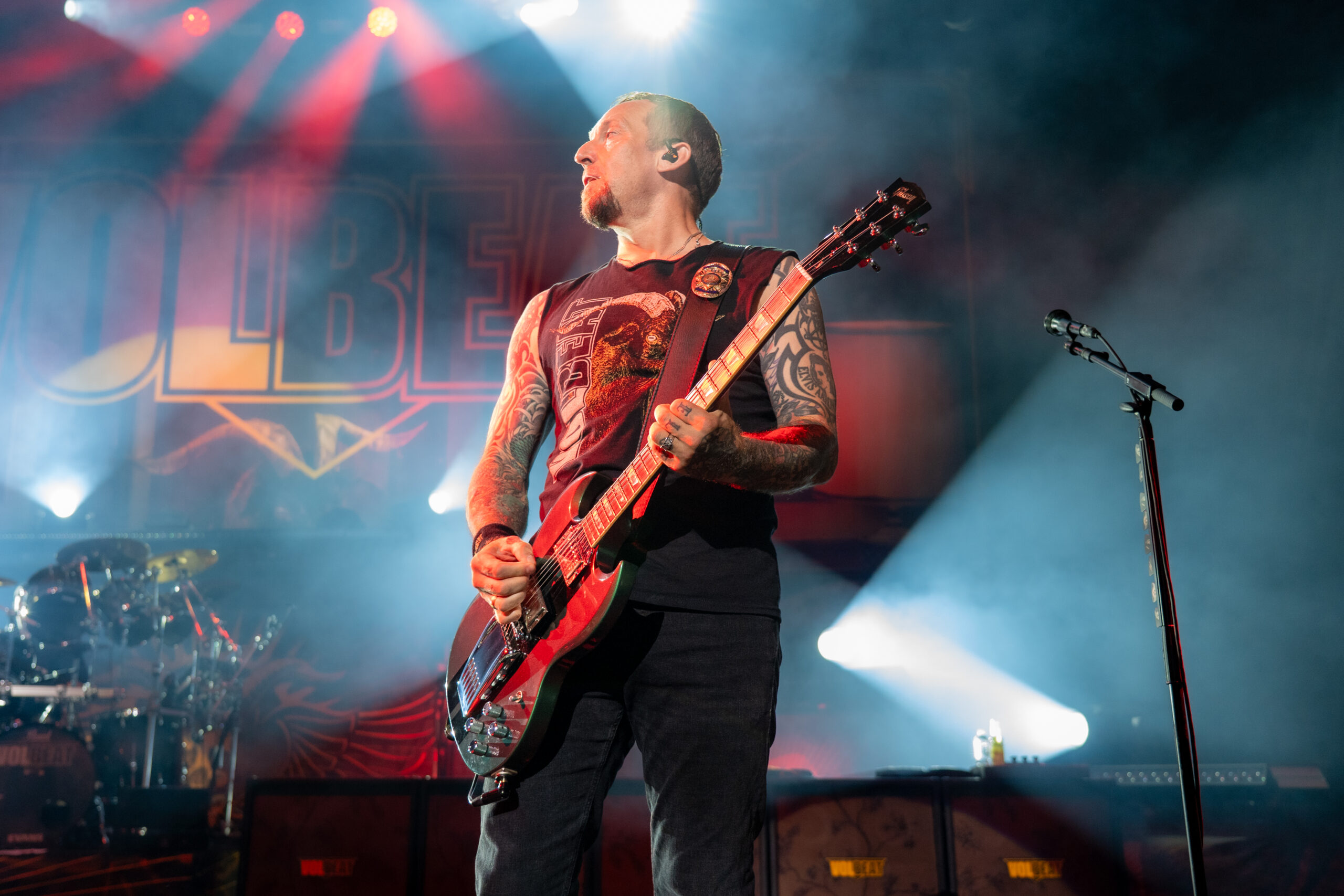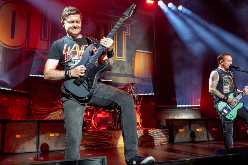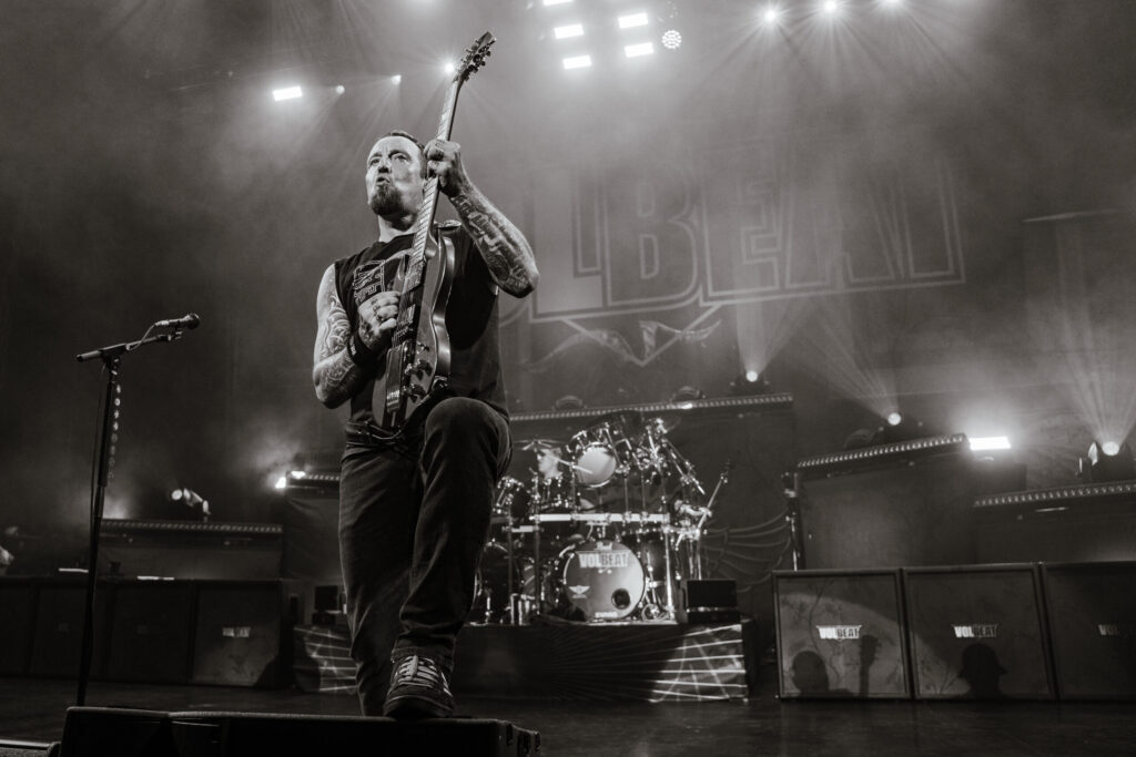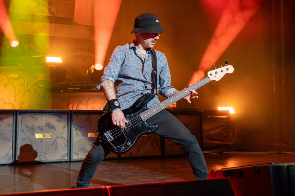 The crowd was buzzing with anticipation as the main event of the night entered onto the stage with a bang: Volbeat. This three-piece group of rock legends had the crowd screaming as they burst onto the stage with the wickedly popular “The Devil’s Bleeding Crown.” With over 143 platinum and gold certifications worldwide, numerous hits holding the #1 spot on the charts time and time again, and over 400 million listens to their top hit on Spotify, “Still Counting,” this band, hailing from the way of Denmark and formed in 2001, has been a recurring name year after year for good reason. With Volbeat’s unique blend of rockabilly, punk rock, and metal, they’ve crafted their own one-of-a-kind sound and have established themselves as true pioneers of the 2000’s on the hard rock and metal scene.